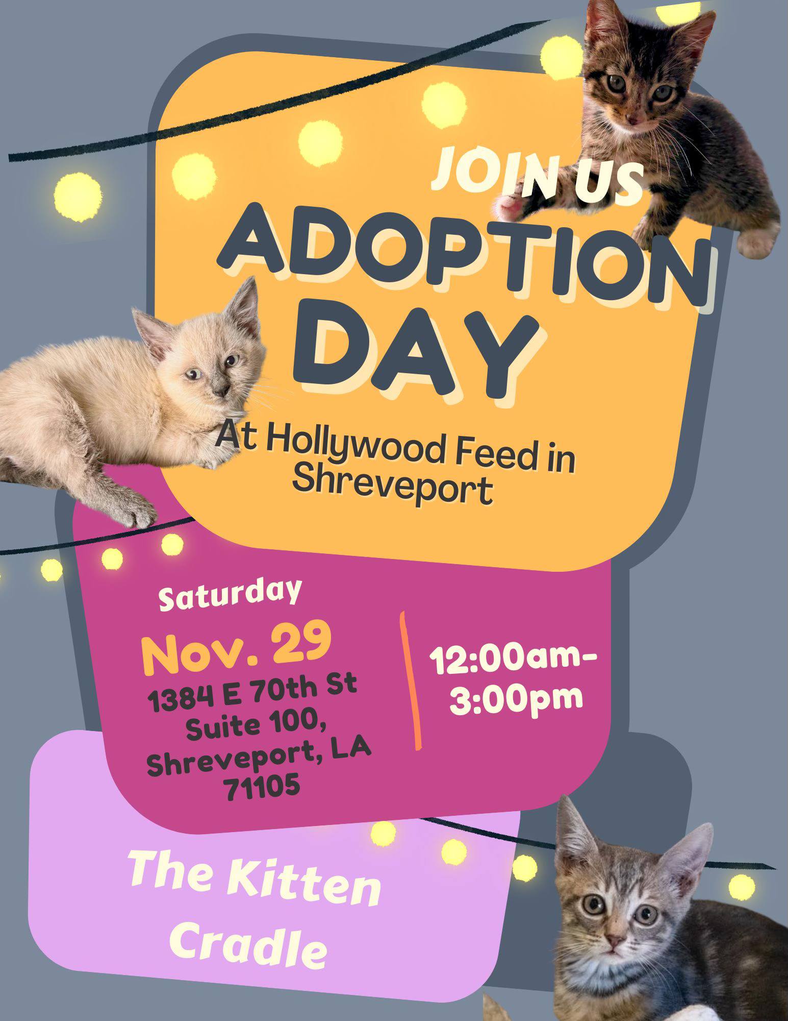 The Kitten Cradle is dedicated to helping kittens in need here in the Shreveport/Bossier City area. We focus on rescuing, caring for, and finding loving homes for them. Through community education and outreach, we also promote responsible and compassionate pet ownership. Our mission is to ensure that every cat has a safe, happy home — and that every adopter is prepared to provide one.